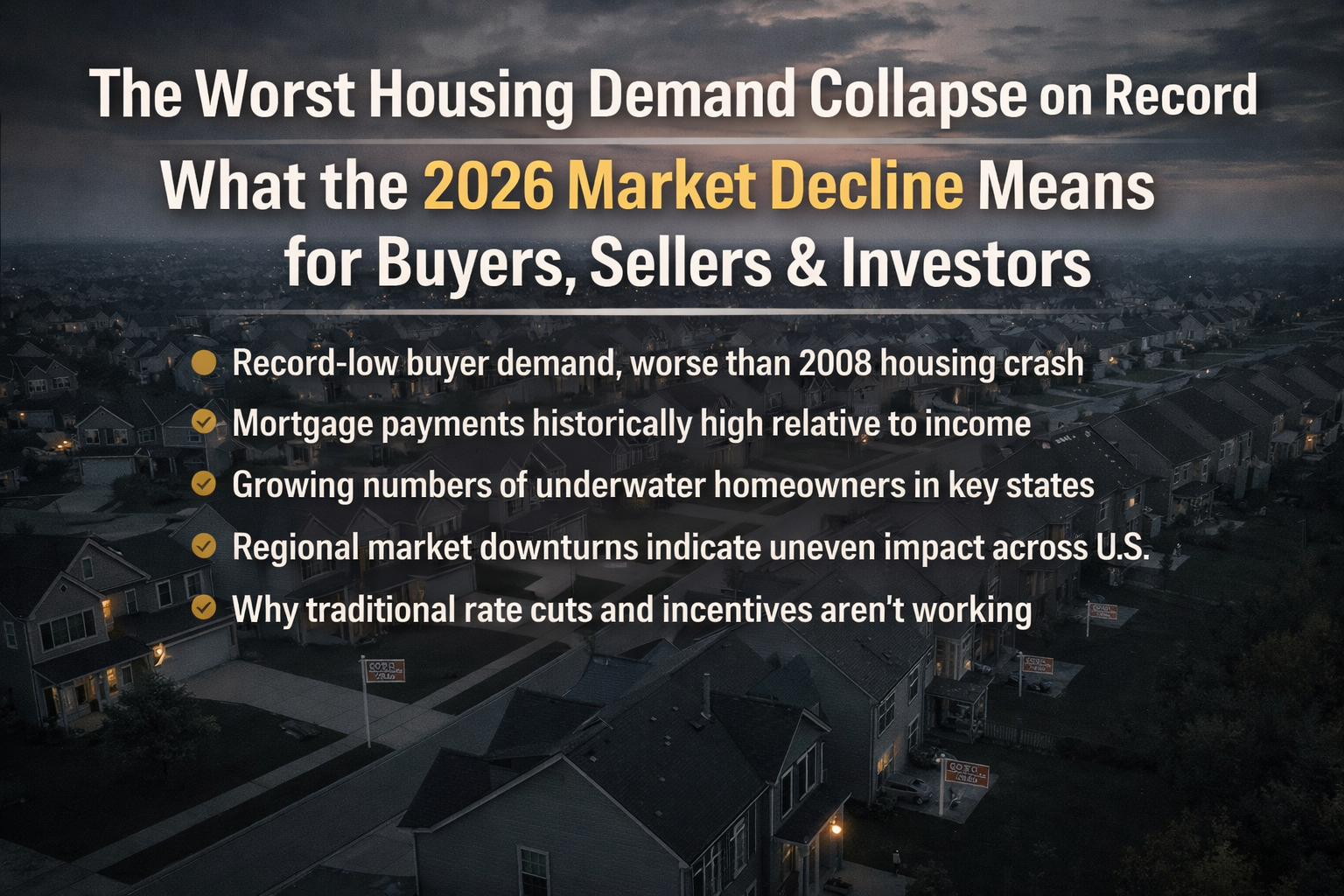 Home buyer demand has now been in decline for multiple years. That duration alone sets this moment apart. Most housing slowdowns are sharp but short. Buyers retreat, prices adjust, rates move, and the market finds equilibrium. What is happening now is different. Demand has stayed weak through rate hikes, through rate cuts, through a pandemic-era boom, and through its unwind. The market is not correcting quickly. It is correcting slowly — and that slow correction carries its own risks.